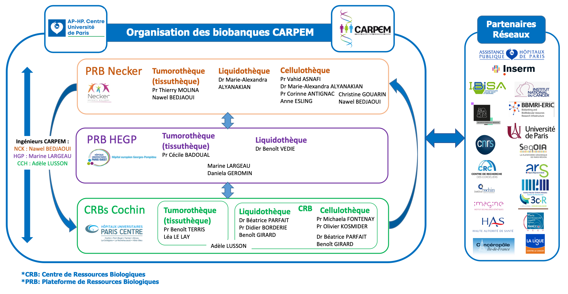 Le CARPEM a pour objectifs de coordonner et d’harmoniser les méthodes de stockage de tissus tumoraux. Le travail collaboratif de ces trois banques de tumeur, grâce au recrutement de trois ingénieurs par le CARPEM (un dans chacune des structures), a permis l’extension du projet OncoHEGP (banque de tumeurs lancée en 2011 à l’HEGP). Nommé OncoCCH à Cochin (2015) et OncoNEM à Necker (2017), ce projet, dédié à la gestion des ressources biologiques collectées au cours de soins standards, a pour objectif principal de renforcer les ressources biologiques disponibles pour la recherche.