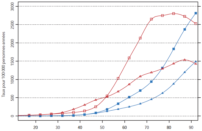 Incidence and mortality of cancer according to ageRed curves incidence; Blue curves mortalitySquare men; Triangle women