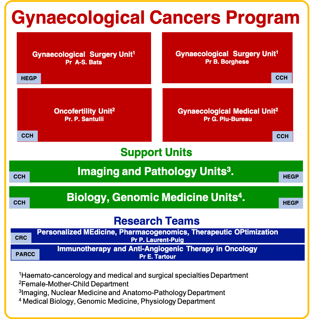 Two sites of Paris Cancer Institute CARPEM have a strong activity in gynaecological oncology: Cochin Hospital (CCH) and European Georges Pompidou Hospital (HEGP). The gynaecological cancers program involves 5 departments of APHP.Centre Université de Paris (Women, mother, and child; Imaging and Pathology; Oncology; Geriatrics and Biology and Genomic Medicine) working together. It is the most important centre dedicated to gynaecological oncology in the Great Paris area (with an ESGO: European Society Gynæcological Oncology accreditation).