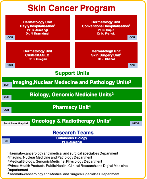 The skin department in our center has a strong focus on skin oncology. Management of skin cancers involves 4 departments of APHP.Centre (Internal medicine, Imaging and Pathology, Biology and Oncology) that collaborate together. It is an important center dedicated to skin oncology in the Great Paris area and at the national level. Our physicians, surgeons and biologists are mainly dedicated to skin cancer patients care and altogether 25 beds are dedicated to onco-dermatology. This program has managed 811 new cases of skin cancer during the last 3 years. It involves 2 sites of the APHP.5 sites (HEGP, Cochin) which are characterized by both medical and surgical strengths. The Dermatology department is also constitutive center of reference for genodermatoses predisposing to cutaneous cancer (CRMR MAGEC).