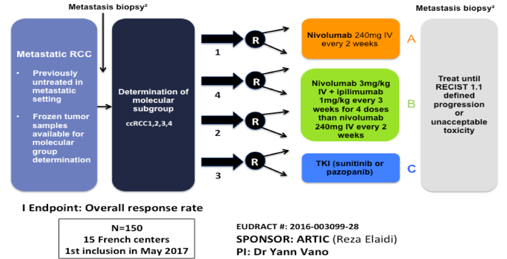 | Kidney | ARTIC A Phase II BIOmarker Driven Trial With Nivolumab and Ipilimumab or VEGFR TKI in Na夫e Metastatic Kidney Cancer (BIONIKK) | II | NCT02960906 | Dr Y. VANO / Pr S.OUDARD |