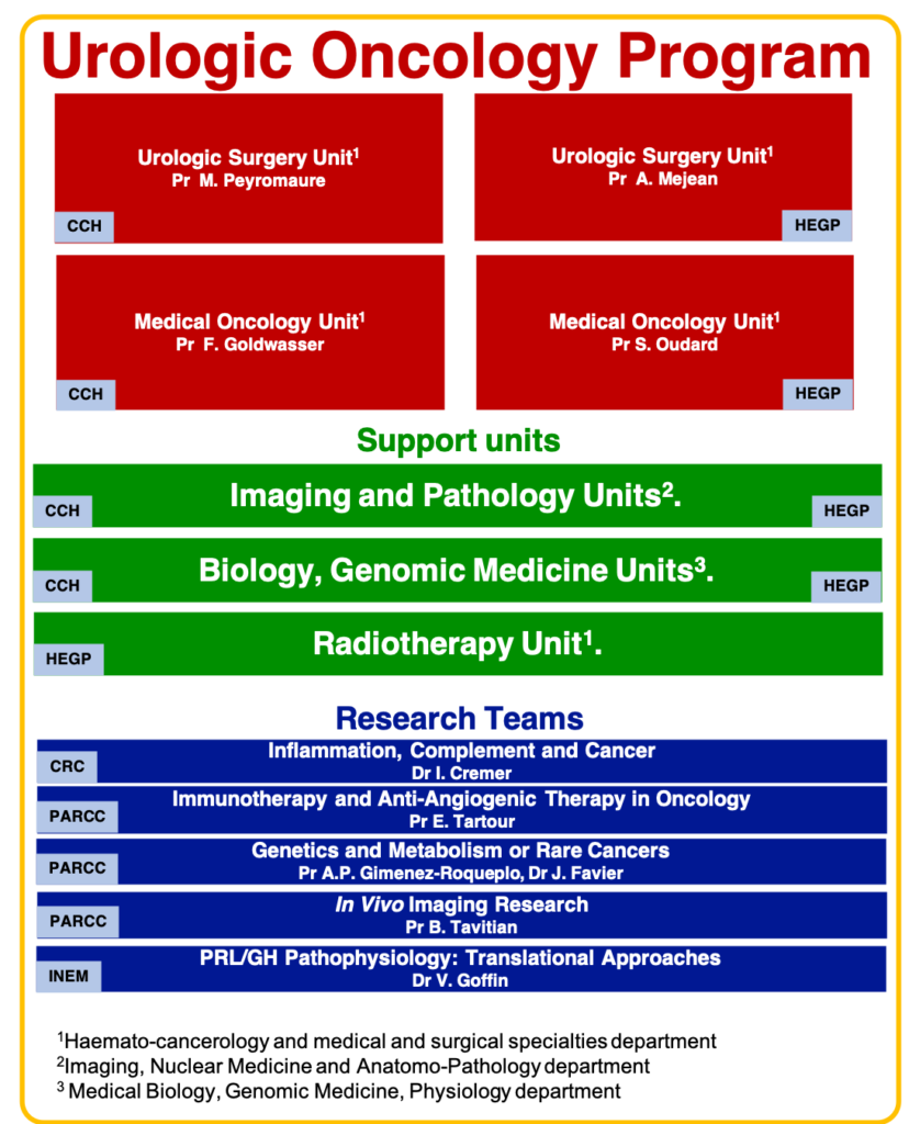 This program developed intensive clinical and translational research in broad fields from surgery to personalized medicine. A strong expertise in the clinical care of metastatic kidney disease from surgery to immunotherapy has been acquired during last years. A first trial based on genomic characterization of kidney cancers has been launched (BIONIKK trial). The program developed also an expertise in robotic prostatic surgery and on focal treatment modalities as well as in personalized medicine and immunotherapy in bladder cancer.
