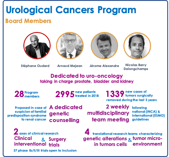 Paris Cancer Institute: CARPEM has a strong activity in uro-oncology and involves 3 departments of APHP.Centre (Hematology and Oncology department, Imaging, Nuclear Medicine and Pathology department and Biology, Physiology and Genomic Medicine department). It is the most important surgical center dedicated to uro-oncology tumor in the Great Paris with national and international expertise in prostate, bladder and kidney tumors. Specifically, 28 beds in urology are dedicated to uro-oncology. This program took in charge 2995 new cases of prostate, kidney, bladder cancers during the last 3 years (see table 2), 1339 new cases of urological tumors have been surgically removed during the last 3 years and 2415 cycles of chemotherapy/immunotherapy have been performed (for detail see annex 1). It involves 2 sites of the APHP.Centre (Pompidou and Cochin hospitals) with very similar organization with both medical and surgery strengths. Furthermore, a dedicated genetic counselling is proposed for patients in case of suspicion of Von Hippel Lindau disease, Birt-Hogg-Dubé syndrome, etc…. One hundred patients and their relatives are addressed to this consultation each year for suspicion of hereditary renal cancers. All these clinical activities are structured around 2 weekly cancer multidisciplinary team meetings. These meetings follow the INCA national guidelines, and ESMO guidelines.