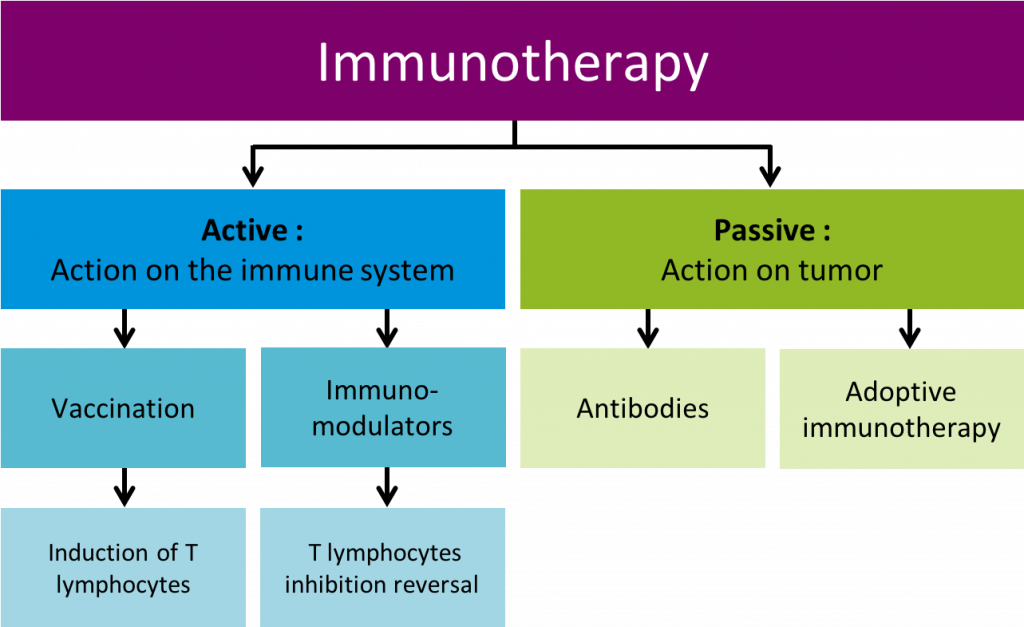 - Cancer immunotherapy encompasses passive, active and immunomodulatory approaches. Passive immunotherapy involves administration of exogenously generated antibodies or adoptively transferred immune cells (typically T cells) that mediate tumor rejection directly.